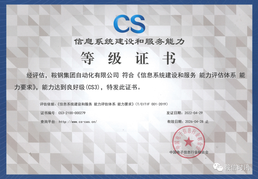 近日,鞍鋼集團自動化有限公司通過了賽寶認證中心和中國電子信息行業(yè)聯(lián)合會的綜合評審及公示,獲得《信息系統(tǒng)建設和服務能力評估體系能力良好級(CS3)證書》。獲得此證書,是對信息化建設和服務提供者的綜合能力要求的認可。